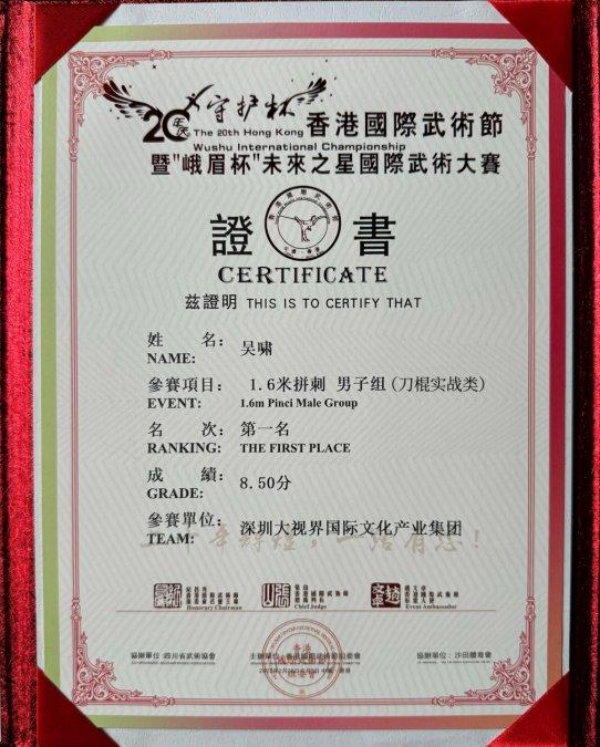 颁奖结束后,活动组委会领导还特别为吴啸颁授了武术推广大使及拼刺教练证书。