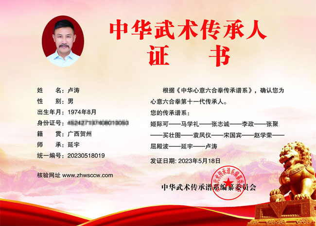 卢涛,1974年生,安徽蚌埠人,师承延宇——心意六合拳第十一代传人,武术协会理事成员,荣获优秀教练员荣誉称号。