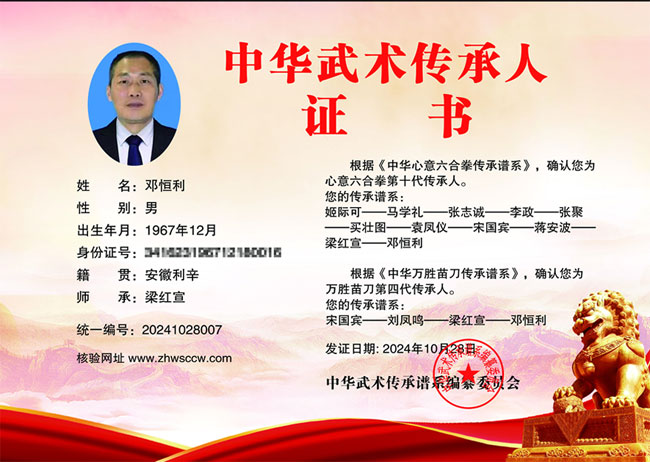 邓恒利,男,汉族,1967年12月出生,大专学历。国家级社会体育指导员,中国武术协会会员,中国武术六段,中国传统武术教练员、一级裁判员,亳州市太极拳协会副会长。亳州市陈氏太极拳协会副会长,利辛县太极拳协会副会长,亳州市健身气功协会利辛县人民医院健身气功站点负责人兼教练。外科副主任医师,健康管理师,高级公共营养师,中医康复师。