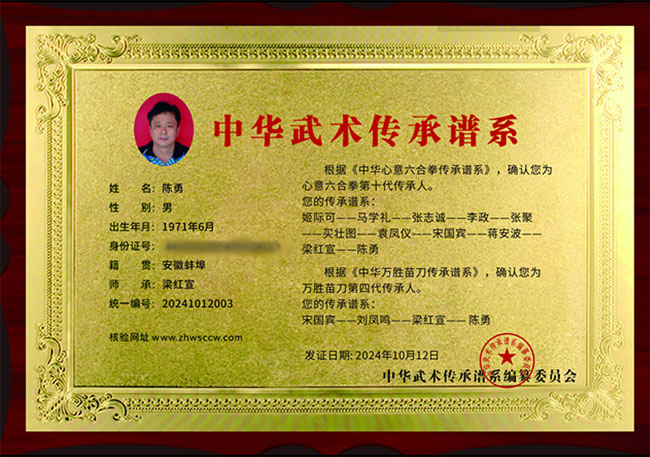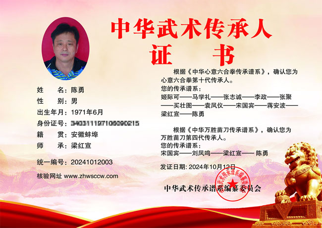 陈勇,男,1971年6月出生。安徽省武术协会理事,蚌埠市武术协会万胜心意六合拳研究会会长。中国武术六段、心意六合拳市级非物质文化遗产代表性传承人、蚌埠市万胜苗刀传习基地教练。国家一级武术裁判。安徽省武协心意六合拳委员会理事。1971年出生自幼跟随师父梁红宣练习少林弹腿,小龙拳,五形拳和心意六合拳,万胜苗刀。蛇龙戟枪,六合大枪,虎头双钩等器械在明师细心的指导下,多次参加国内国际武术大赛,均获佳绩。