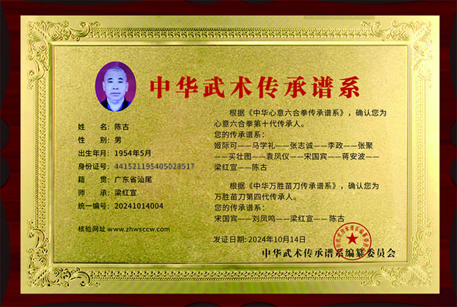 早年在家乡拜多名拳师习武,1993年拜中原大成拳技击家,养生家李照山先生为师,系统修练大成拳法,深得大成拳养生,健身,功力按摩,技击等秘法,在巜精武杂志》,巜武当杂志》,巜少林与太极杂志》发表了多篇大成拳文章,在《武当杂志》刊出了南粤忠武真传人陈古先生简介和名家精英风采照片。