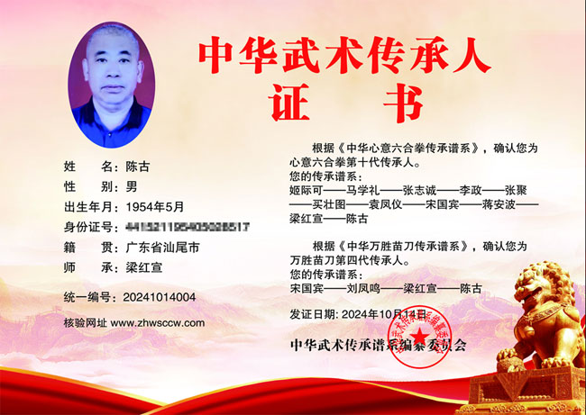 陈古,男,生于1954年5月。广东省汕尾市海丰县人。中药师,现任汕尾市武术协会监事长,安徽省蚌埠市万胜苗刀传习基地总部副会长兼秘书长,非物质文化遗产万胜苗刀汕尾市陈古传习基地会长,蚌埠市武协心意六合拳专业委员会副会长,安徽省心意六合拳教练员,河南省信阳市武术协会大成拳工作委员会副主任,香港武当一炁五行门武术总会聘为荣誉会长,中国武术协会会员,中国武术段位形意拳六段,国家武术套路一级裁判员。2021年和2022年“富丽杯”汕尾市第十届,第十一届传统武术精英赛担任仲裁。