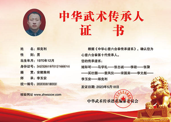 郑克利,安徽蚌埠人,师承李玉安——心意六合拳第十代传人,武术协会理事成员,荣获优秀教练员荣誉称号。