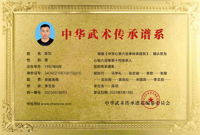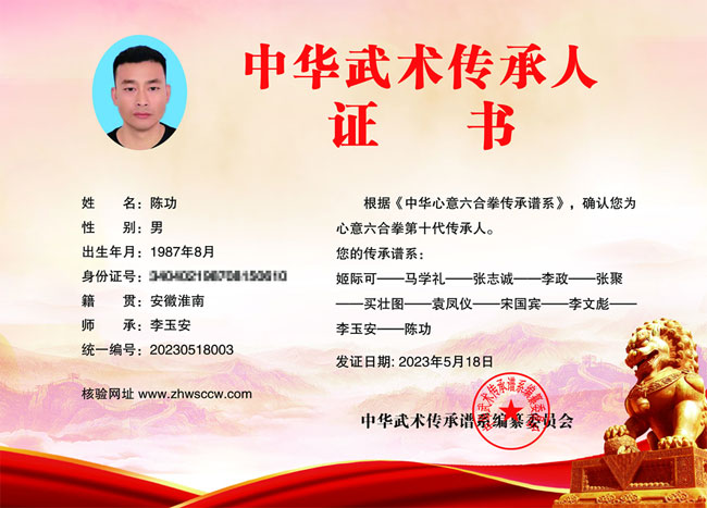 陈功,1987年出生,安徽淮南人,大专学历,淮南武术协会副主席优秀教练员,心意六合拳第十代传人。