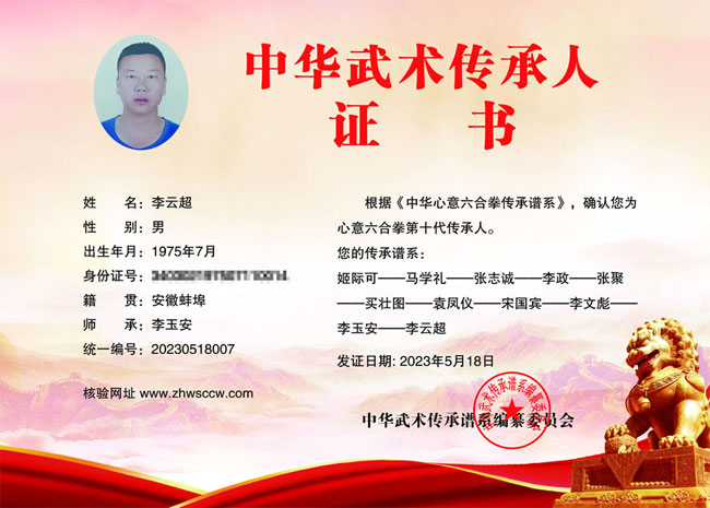 李云超,1975年生,安徽蚌埠人,师承李玉安——心意六合拳第十代传人,武术协会理事成员,荣获优秀教练员荣誉称号。