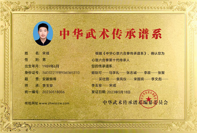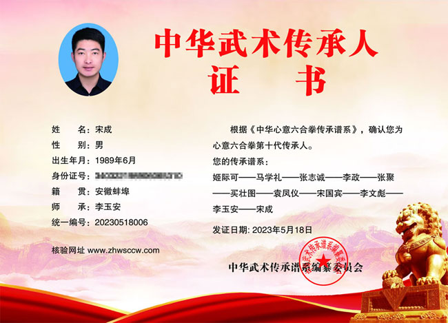 宋成,1989年生,安徽蚌埠人,师承李玉安——心意六合拳第十代传人,武术协会理事成员,荣获优秀教练员荣誉称号。