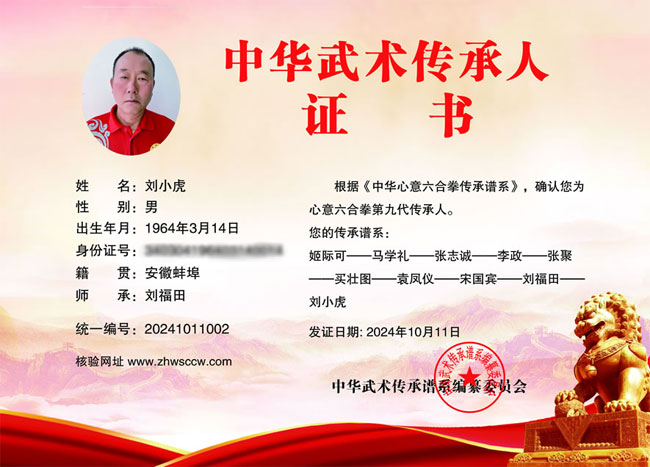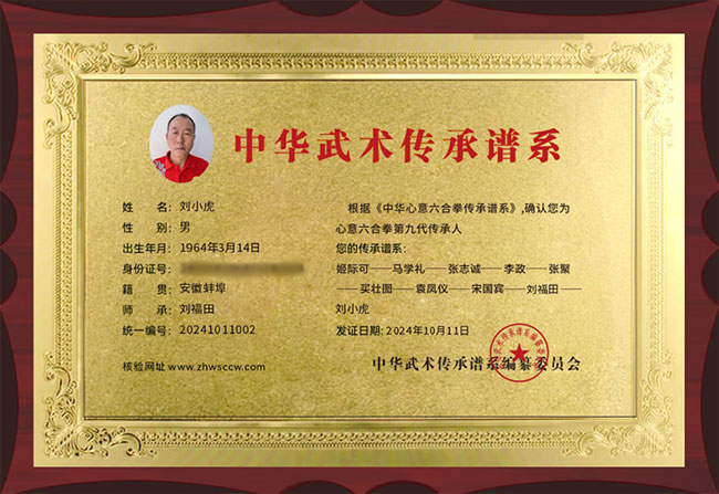 刘小虎1964年生人,心意拳一代名师刘福田的幼子,自幼习武,师承家父拳法,技艺,潜心钻研心意拳,系蚌埠市非物质文化心意六合拳第三代传人,安徽省武术協会心意拳研究会副会长,蚌埠市武术協会常委,国家一级武术师,武术六段,自2002年至2010年期间多次参加全国性武术赛事,荣获个人单项金牌七枚,银牌三枚,2007年参加安徽省武术大会黄山论剑获一等奖,特别是2010年代表安徽省参加在湖北十堰市举行的第四届世界传统武术锦标赛中获心意拳冠军,双刀亚军的好成绩。2011年,2012年,2014年领队参加了北京武术邀请大赛,获24金,7银的骄人战绩!2011年组队参加了安徽省第一届武术大会,共获四金四银。2018年领队参加了安徽省第十四届运动会开幕式武术表演。为发扬光大传统文化,传承心意拳,2006年自筹资金创办了尚武学社,招收5周岁以上的武术爰好者,親自授课,一招一式,规范到位,现有学员四十余人,2015年14名学员参加少儿武术大赛获12金,7银,2016年在蚌埠达人秀获集体二等奖。受到社会各界及家长的好评。