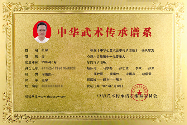 张宇,1986年生,河南郑州人,师承延宇——心意六合拳第十一代传人,武术协会理事成员,荣获优秀教练员荣誉称号