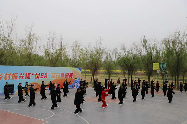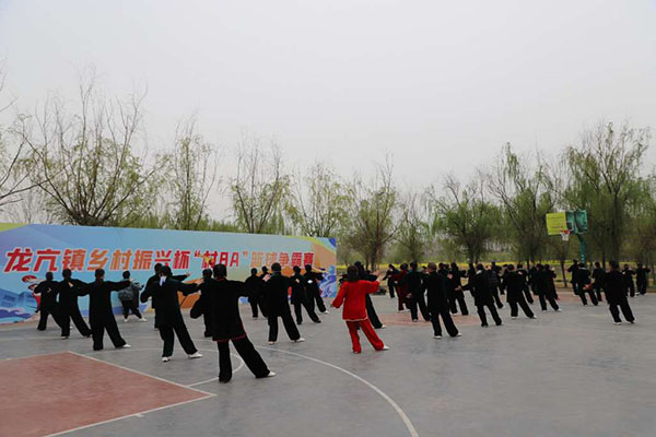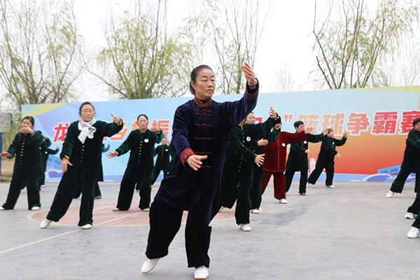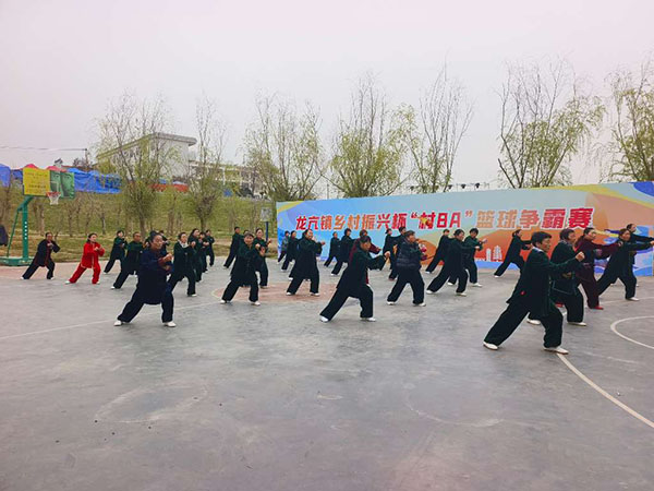 在龙亢小学篮球场内,伴随着悠扬的音乐响起,身着统一服装的太极拳爱好者在怀远县武术协会主席马湲老师的带领下,舒缓起手,开合有势、刚柔并济,一招一式,诠释着太极拳24式的柔韧与魅力。