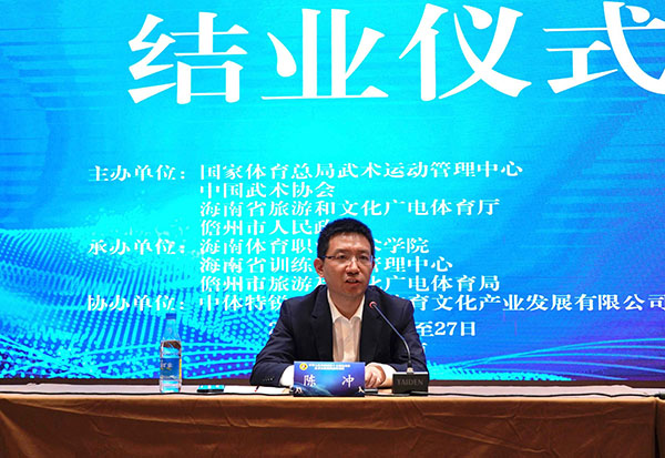 2025年3月27日下午,第十五届全国运动会武术比赛裁判员培训班在海南儋州落下帷幕,来自全国32个单位的191名武术套路和武术散打裁判员顺利完成了为期4天的培训与考核。国家体育总局武术运动管理中心副主任、国家武术研究院副院长、中国武术协会副主席陈冲出席结业仪式并讲话。仪式由国家体育总局武术运动管理中心武术套路部负责人郑楠主持。