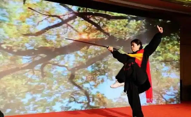 东营市龙威武术带来的器械表演环节精彩纷呈,双刀表演令人目不暇接,刀光闪烁间,仿佛能看到古代将士征战沙场的英姿,将传统武术的传承之美展现得淋漓尽致。
