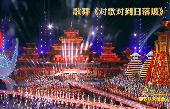 除央视1号厅的直播现场,今年春晚还在贵州黔东南、广东珠海、山东曲阜·泰安和海南三亚等地设置了四大分会场。分会场的节日盛况不仅体现了华夏广袤大地上风格迥异的风土人情和文化特色,更是由人民相聚广场的场景传递出一种开放性的文化气质。