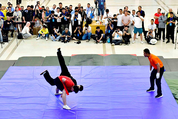 6月12日,来自中国陈家沟太极拳辅导站代表队的杨奉豪(左)与印度尼西亚代表队的戈拉尼布拉纳在竞技推手比赛中。