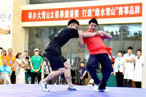 6月12日,来自中国陈家沟太极拳辅导站代表队的杨雁博(红)与马来西亚代表队的林彬豪(黑)在竞技推手比赛中。