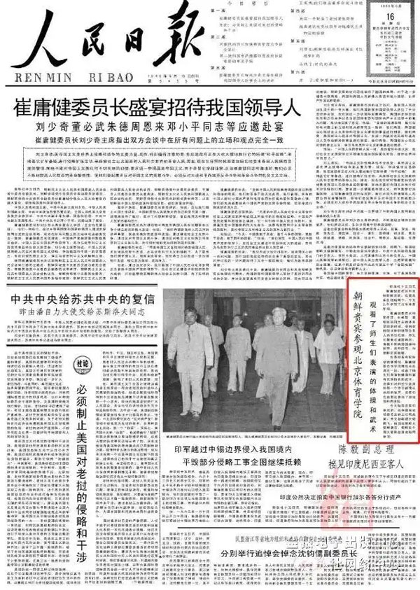 1963年6月15日,周恩来总理陪同朝鲜民主主义人民共和国最高人民会议常任委员会委员长崔庸健来我校参观。当时,周总理带着外国元首来北体参观,每次都必定参观由北体武术系编排的拳法套路。