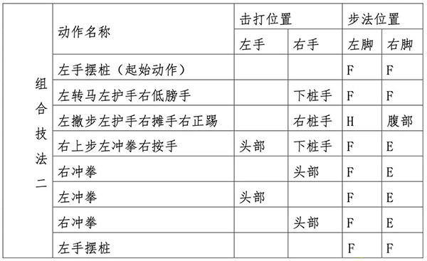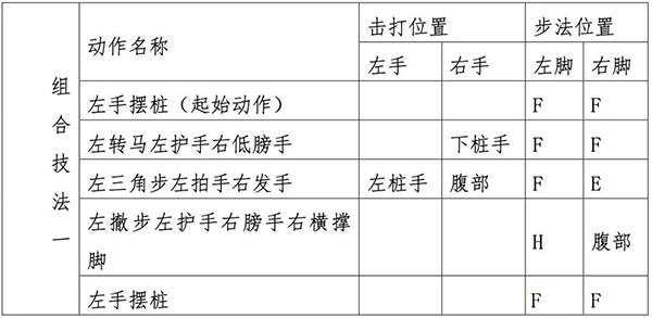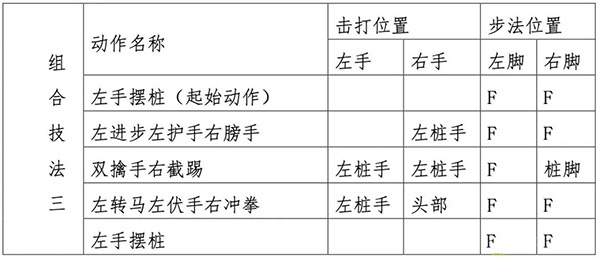 ②咏春拳组合技法功力赛一:按以下组合技法动作和步法顺序,连续击打功夫桩;