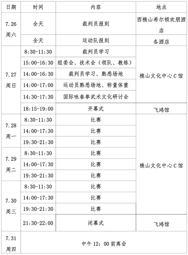 2025国际咏春拳大赛(境内组)将于2025年7月26日至7月31日在广东省佛山市南海区西樵镇举行。为使各参赛单位做好训练和参赛工作,现将《2025国际咏春拳大赛竞赛规程(境内组)》印发给你们,请遵照执行。