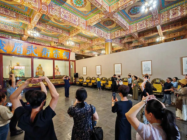 随后,王超引导嘉宾参观峨眉武术宗祠与博物馆,系统介绍了峨眉武术的起源、历史演进及当代发展情况。他提到,峨眉武术在明清时期发展至鼎盛,形成多个门派与丰富拳种,在川渝及周边地区广泛流传。但随着时代发展,面临传承人年龄断层、现代体育竞争等挑战。近年来,依托国家非遗保护政策,政府通过资金支持、传承人培养、国际推广等举措,为峨眉武术的传承发展注入新动能。