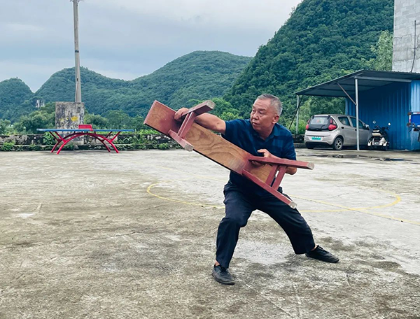仲夏夜,安龙县排冗村纳闹组。虫鸣声中,活动室篮球场灯火通明,十多个孩子正跟着韦修尧、韦修定两位武师正在训练,木棍破空声与板凳撞击声交织成独特的韵律。这是布依族武术最鲜活的传承场景。