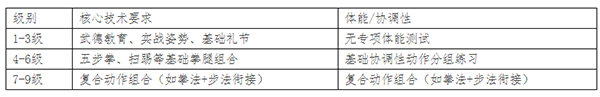 1.所有级别均需掌握 武术礼仪(如抱拳礼)和 武德规范。
