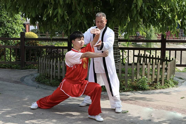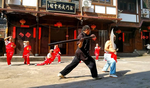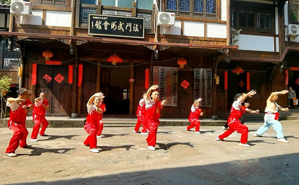 当天上午,石桥古镇褪去平日里的嘈杂,街口的古代牌坊下,“法门武术会馆”门口,传承人率弟子们抱拳列阵登场,集体练功的场景引来游客喝彩,打破了古镇的宁静。