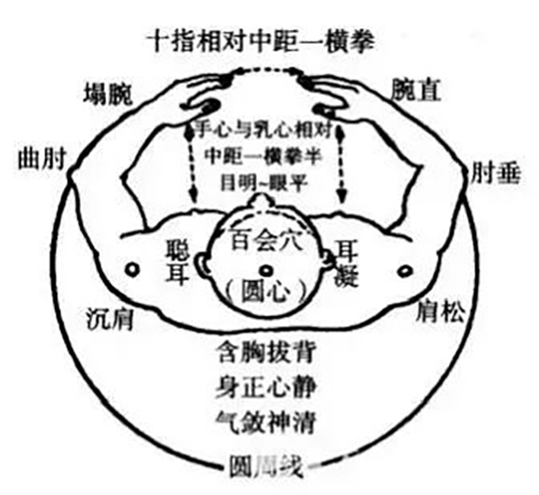 身上姿势对了,双手一环抱,尽量成圆,掌心对着自己胸部,五指自然分开成势。膝盖微微下蹲,蹲到什么程度?全身感觉浑圆了就成,这就是浑圆桩的根骨所在。你按照我说的要求都站对了,慢慢往下蹲,全身有了圆球一体的感觉,这个时候刚刚好。有的门派有高中低姿态各种浑圆桩,系为练拳所设,彼道非吾道。