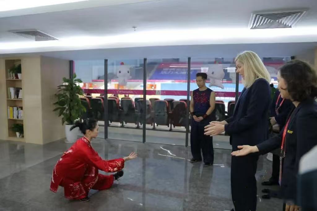 当天上午,全运会武术套路竞赛委员会执行主任、体育总局武术中心主任、国际武联秘书长张玉萍会见了考文垂一行,并陪同观看了男子剑术和女子刀术比赛。赛后,考文垂与本届全运会冠军童心、李剑鸣亲切会面。两位冠军分别展示了太极拳和南拳,引来考文垂的连声赞叹和鼓掌。考文垂说,今天来南沙观看武术比赛感觉非常精彩,在现场看到运动员们的招式非常优美,这是一场充满力与美的比赛。她表示,武术将在2026年达喀尔青奥会正式登上奥运舞台,“我们将中国武术带到非洲大陆,这是一件让人兴奋的事情。”