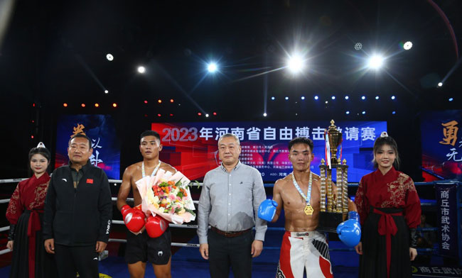 本次邀请赛由河南省体育局、商丘市人民政府指导,河南省武术体操冰雪运动中心、商丘市教育体育局主办,商丘市武术协会承办。14日晚,河南省体育局副局长田间、商丘市教育体育局局长韩涛、河南省武术体操冰雪运动中心主任晏猛等观看了2023年河南省自由搏击邀请赛决赛。