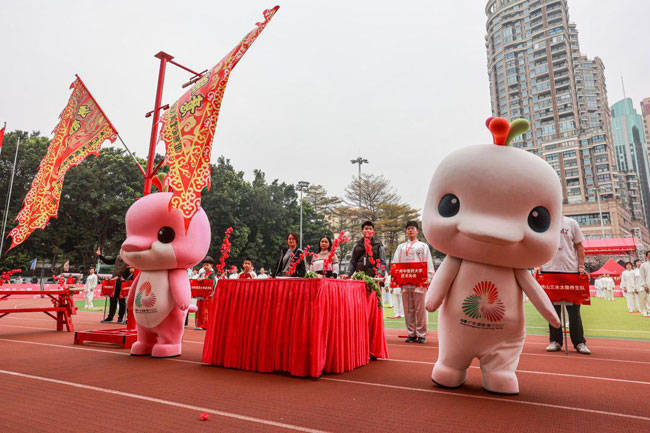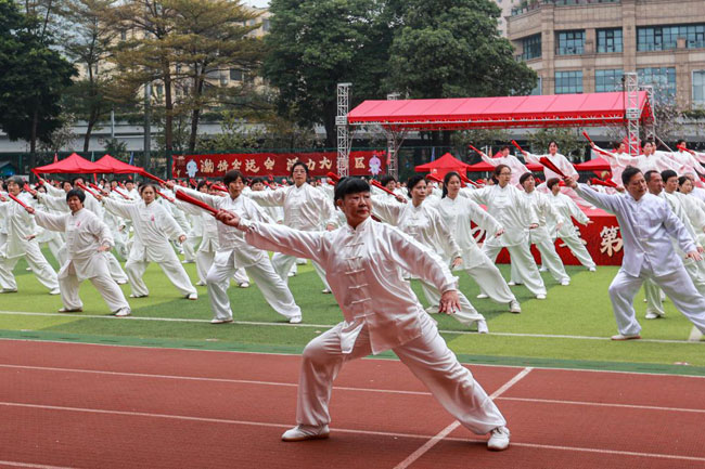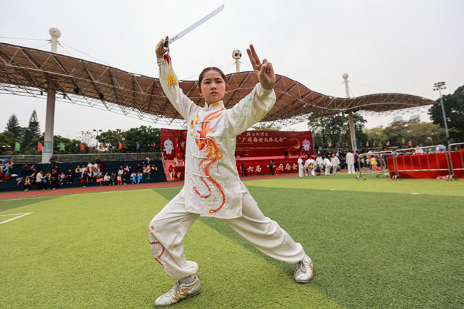 2月16日,第六届“广府庙会武林大会”在广州市越秀区东山体育场举行。作为广府庙会的系列活动之一,本次活动以“激情全运会 活力大湾区”为主题,融入十五运会和残特奥会吉祥物、会徽和主题口号等丰富的体育文化元素,吸引了近千名市民现场观摩。