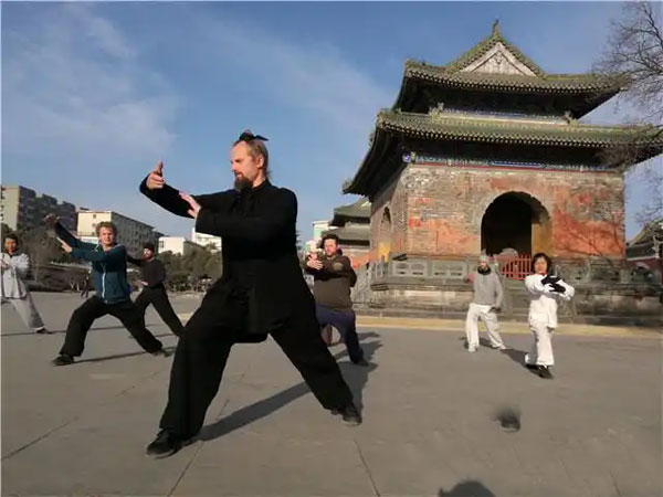 “Sink(下沉)、Turn right(向右)……”3月25日清晨,武当山下玉虚宫,袅袅薄雾中,一名金发盘髻的“洋教练”带着4名“洋弟子”打太极拳,行云流水,颇具神韵。