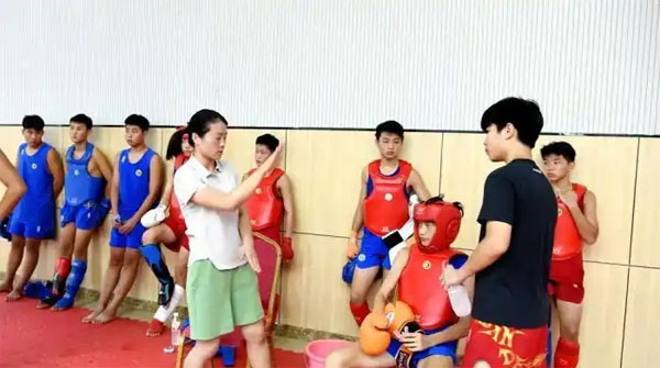 队员上场前,中国香港武术散打队教练张琦媛为队员讲解动作