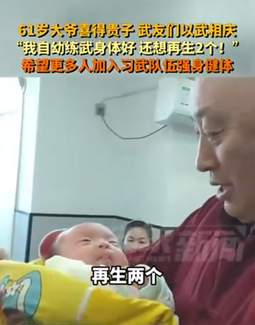 近日,一位61岁大爷喜得贵子,武友们以武相庆。大爷自幼练武身体好,称还想再生2个。