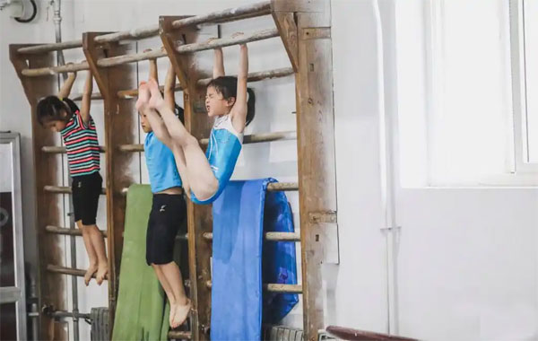 2021年6月23日,五岁的王忆楚(右一)在练习肋木时,有点吃不消