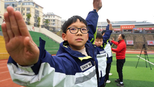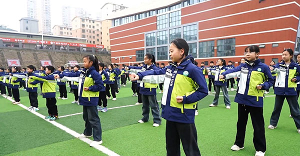 在学校操场上,一百多名学生排列成方阵,在武术老师的指导下扎稳马步,抬手出拳,一招一式整齐划一、沉稳有力,将中国传统武术的恢宏气势展现出来,一套拳法打下来,学生们精气神满满。