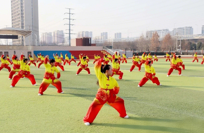 进入集中训练阶段,队员们开启了高强度的练习。彼时,冬日的寒风凌冽刺骨,但没有一个人因此退缩。每天大课间和体育课,校园的操场上都能看到他们矫健的身影。压腿、踢腿、出拳、扎马步,重复着看似枯燥的动作,却没有人喊累。郑超老师鼓励着同学们,悉心指导,在训练中,不放过任何一个瑕疵,耐心纠正每一个动作。队员们相互打气,彼此切磋,共同进步。随着比赛日期的临近,训练强度逐渐加大,但大家的热情和决心愈发高涨。仿佛再严寒的天气都无法阻挡同学们对武术的热爱,那一颗颗炽热的心在冰天雪地中闪耀着坚忍不拔光芒。