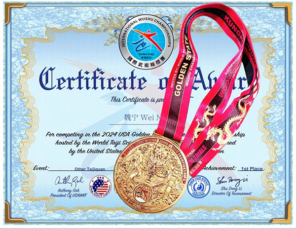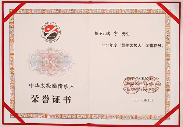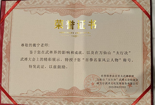 荣获2023年度太极网“最美太极人”称号,2024年度“国际武林百杰”;2024年度世界体育总会亚太武博联盟授予“百拳名家风云人物”荣誉称号;2024年度全国传统武术及太极拳百派名师名家技术展演大会上评选为“武术名家”和“优秀武术传承人”。