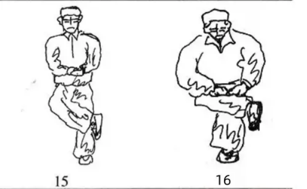 右脚提起,放置贴紧于左膝上端,同时两掌十指交叉(指贴手背),两手心朝上,置于丹田处,全身正直(图14)。
