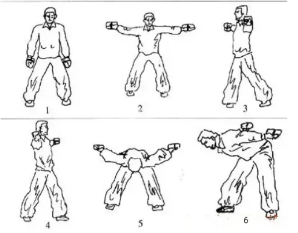 双脚分开自然站立,双手持沙袋,左转90°时,喷气,右手持沙袋排打左肋,身体右转时左手排打右肋。两肋自上而下各排打5下,接着自上而下排打两胸腹各5下。