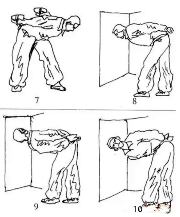 双掌背后相叠,左手握着右手腕,头挺直,上体前俯,向前往下弯腰90°。用头部前额处顶于墙壁上,头与后背部平直,背部不能凹下或凸出(图8)。