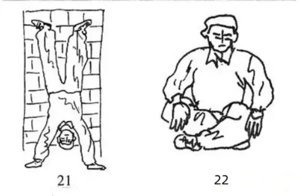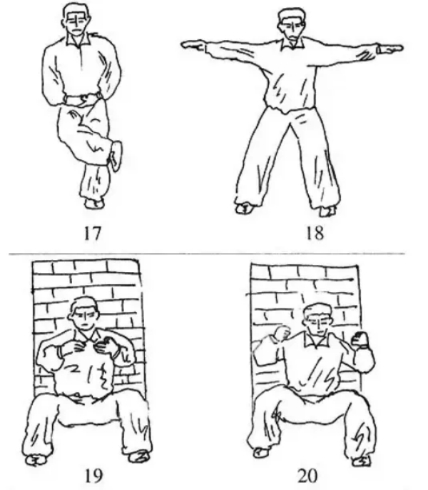两掌内握变拳,两拳心相对,猛喷气,全身用力,收肛提阳,十趾抓地,意守丹田,舌抵上腭;同时两臂屈肘用力向后带动整个后背部猛撞墙壁,头向前下勾(图20)。