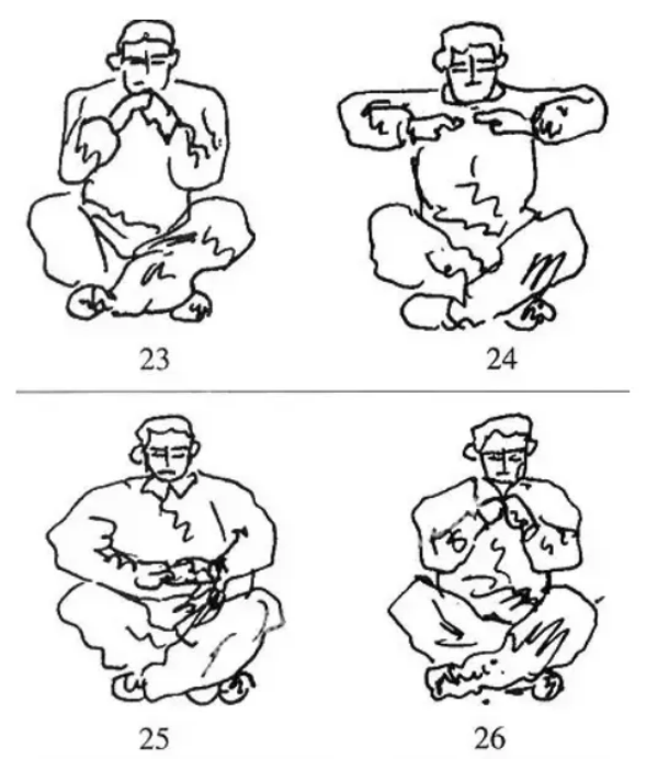 右脚向左后侧叉步,与左脚相靠,两腿下坐,成盘坐式。两手自然下垂,贴于两膝上,两手心向后。全身放松,头正,双眼平视,眼皮放松,缓缓闭目,气沉丹田,自然呼吸,意守丹田(图22)。