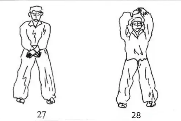 身正而立,双手自然下垂。自然呼吸,两掌在身前交叉,两手心相叠(图27)。两掌相叠由下向上于身前翻掌举起,两手心向前与头同高,两手到脸部相距约15厘米(图28)。