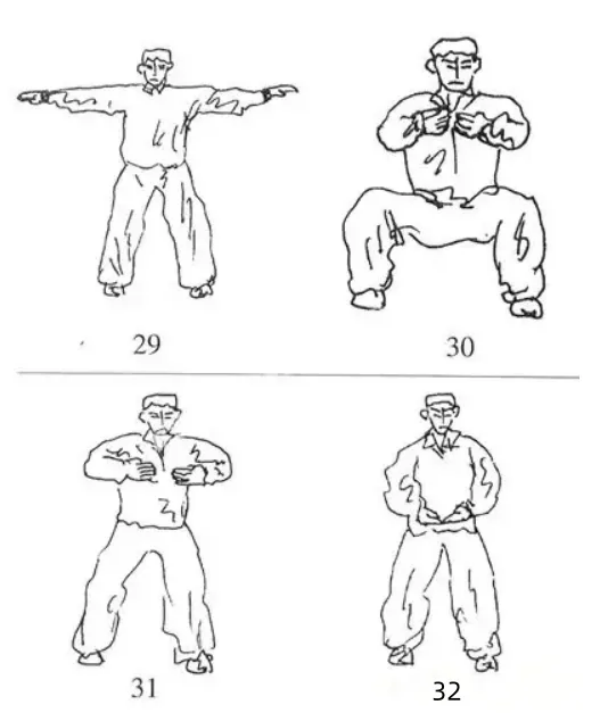 两掌左右分开,两臂与肩平,两手心向下(图29)。吸气,十趾抓地,全身放松,意守丹田,舌抵上腭。同时屈膝下蹲90°,成马步。两掌由两侧向身前直臂环形画弧,两掌心向内,十指尖相对,成抱球式(图30)。