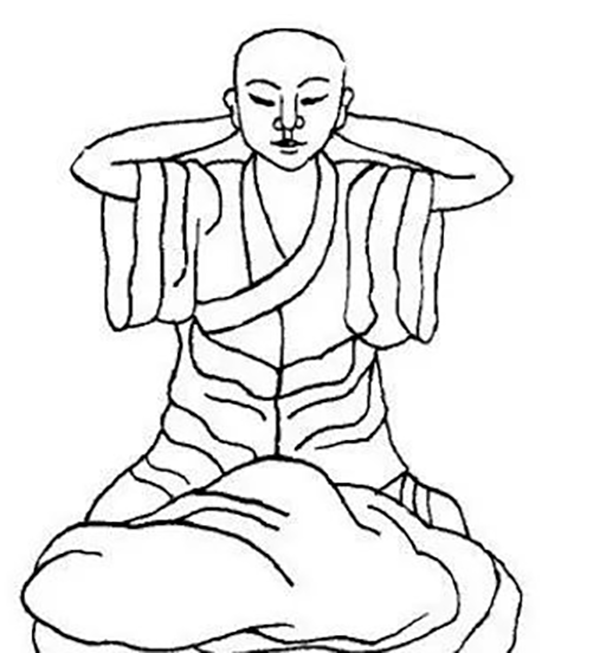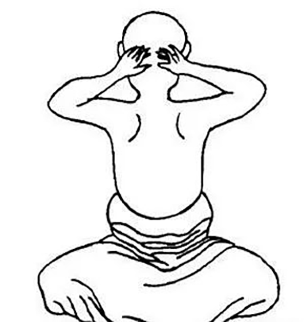 原注:上下牙齿,相叩作响,宜三十六声。叩齿以集身内之神,使不散也。昆仑即头,以两手十指交叉,抱住后颈,即用两手掌紧掩住耳门,暗记鼻息九次,微微呼吸,不宜有声(图2)。