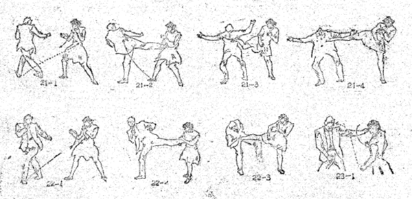 迅速提右膝,由内向外反跷对方腹部。如图22一8所示。