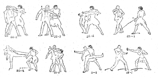 歹徒仲手欲摸我脸,我可向右侧外闪,同时曲肘竖左臂,格挡其来手。如图24-1所示。