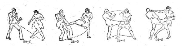 身体突然下蹲右转,右手贴对方之腿旋升并曲肘,置对方腿于我右肘弯之中,然后身体前倾,以左直拳迎击敌之颜面,如图27--s所示。