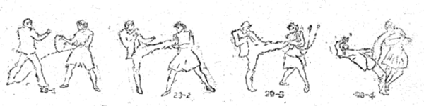 我与对方均以右服在前相对(图29--1)。对方突然发后边的左腊向我蹬来,我可在后闪的同时次手由下向上合接来腿。如图28-2所示。