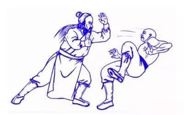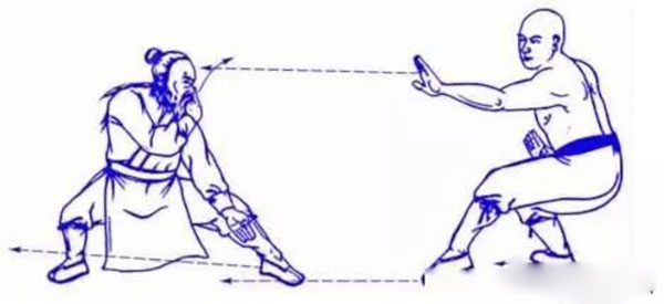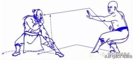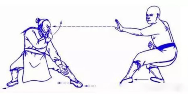 2.敌方左脚前移步,右脚向前跨步直踏我方洪门,同时,右掌劈打我方面部。我方见势,迅疾向后撤退左脚一步,沉身成右钓马步之际,左掌向上托住敌方右腕下侧。