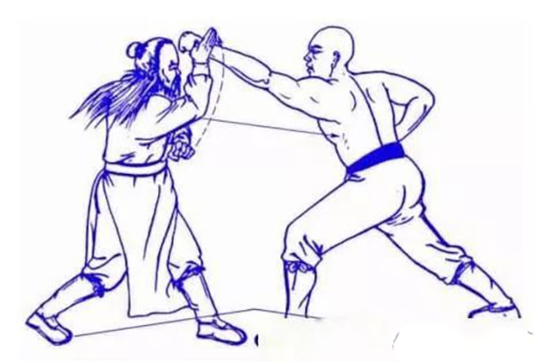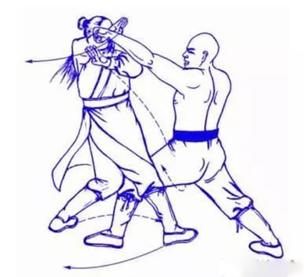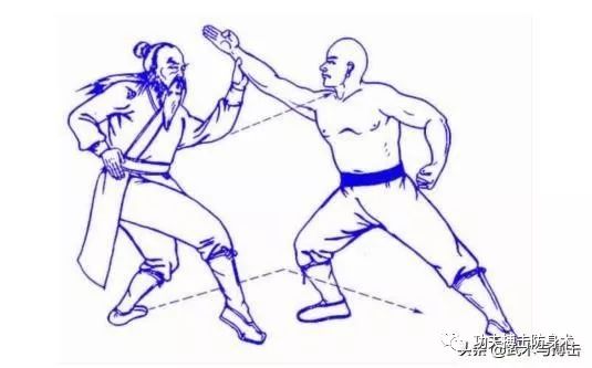 2.敌方右脚垫步,左脚踏向我方左脚前之际,左拳击打我方面部。我方见势,速后滑步避其锋芒,右掌以掌棱为力点,斫击敌方左腕外侧,将其拳推向一边。